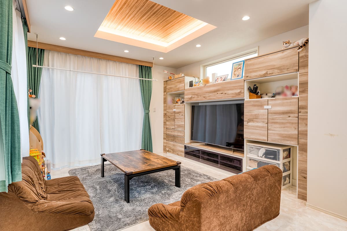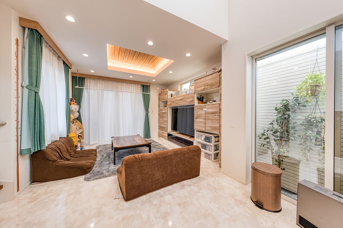 ライトコートを設置し、3面彩光で明るく開放感あふれるリビング。