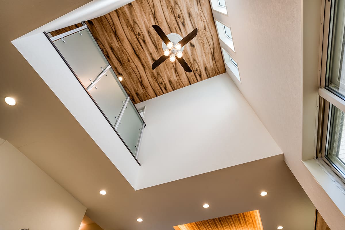約5mの高さの吹き抜けで、豊かな彩光と開放感を確保。自動昇降機能付のシーリングファンライト でメンテナンスも楽々。