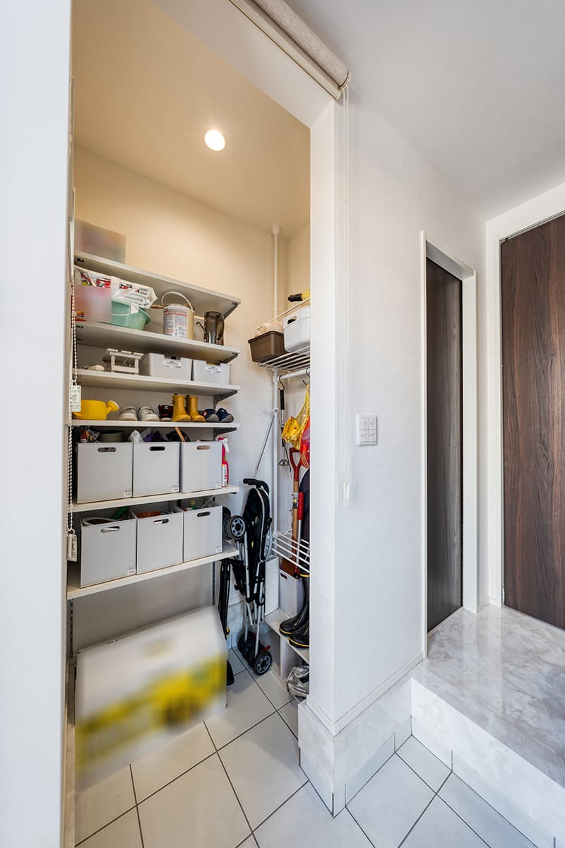 ベビーカーやシャベルなど屋外グッズをたっぷり収納出来る玄関横土間収納。