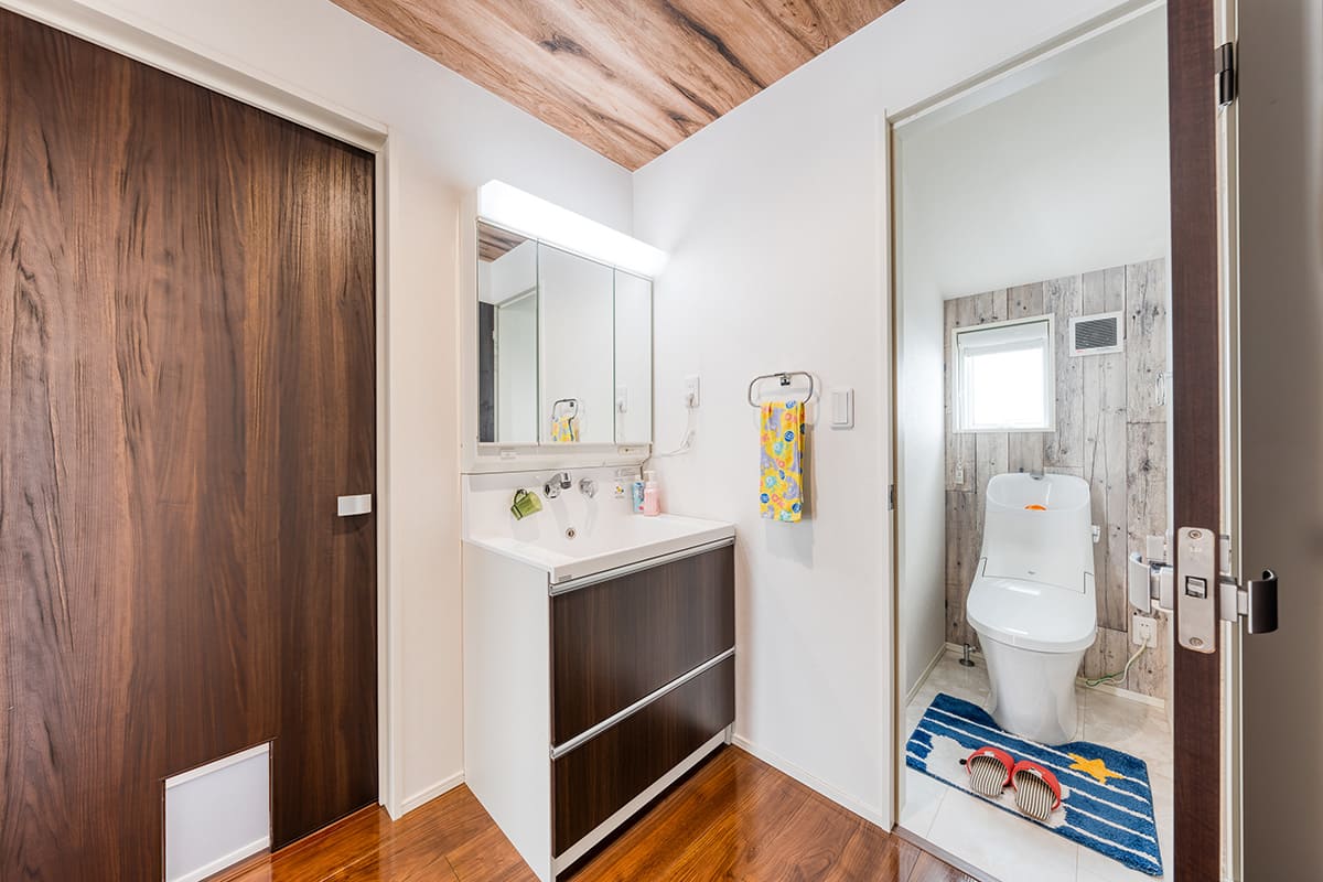 トイレと分離する事で混み合う時間もストレスが少ない2階洗面化粧台。