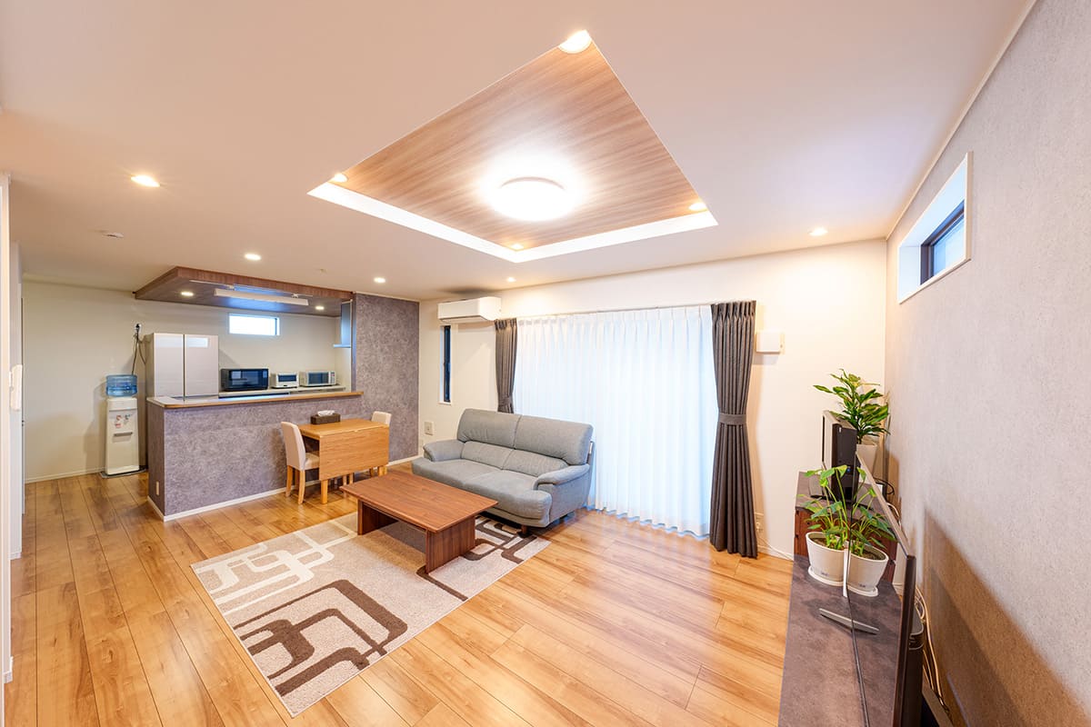 幅、高さにこだわった大きな窓と折り上げ天井でスッキリと開放感あふれるリビング。