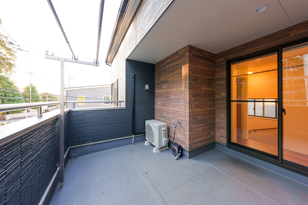 庭代わりにアウトドアを楽しめるテーブル配置も可能なビッグバルコニー。