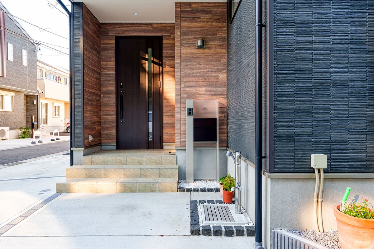 アクセントの木目調外壁が目を引くエントランス。2台分の駐車場横には洗車だけでなく、帰宅時の汚れ落としにも便利なシャワー付き立水栓を配置。