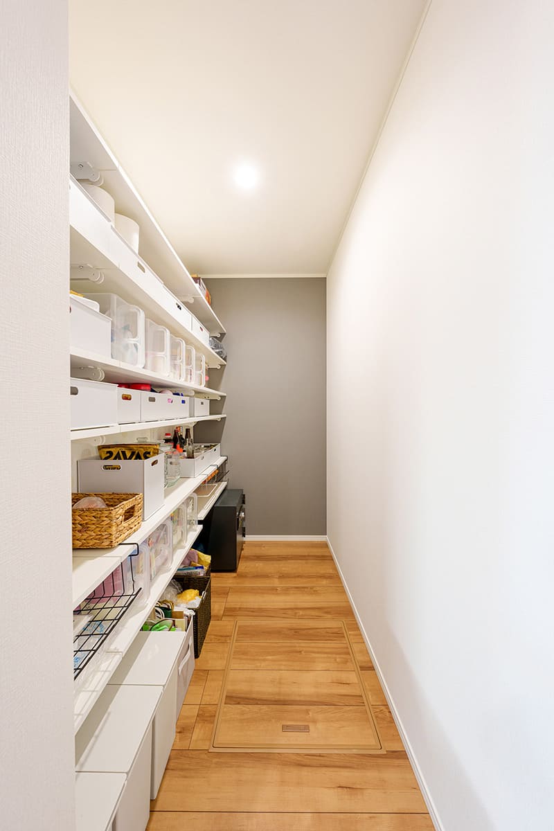 キッチン横には2.2m幅のカウンターを6段設置。床下収納との使い分けで大容量のパントリーを実現。
