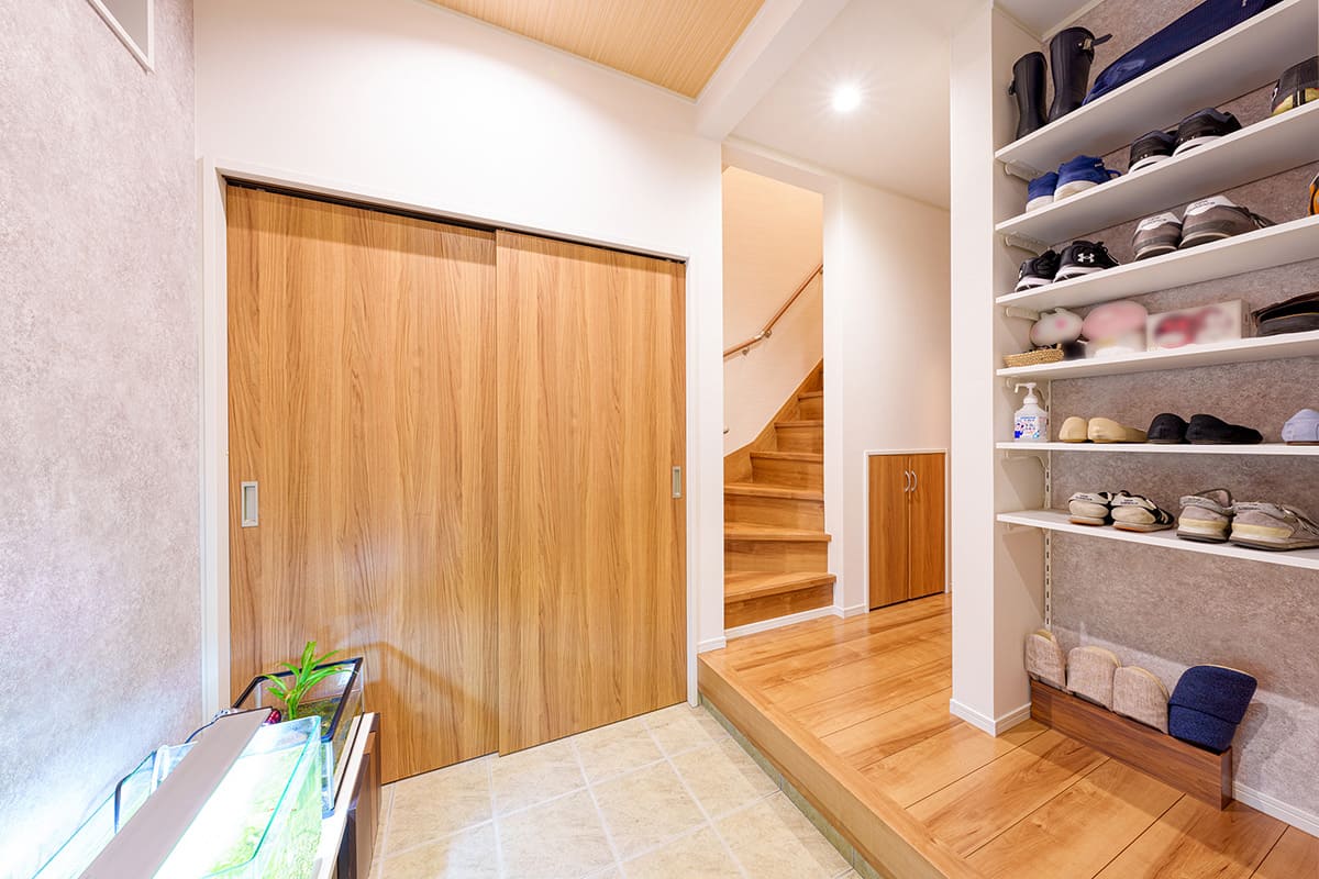 オープンラックと1畳の土間収納でモノのあふれないスッキリとした玄関廻り。