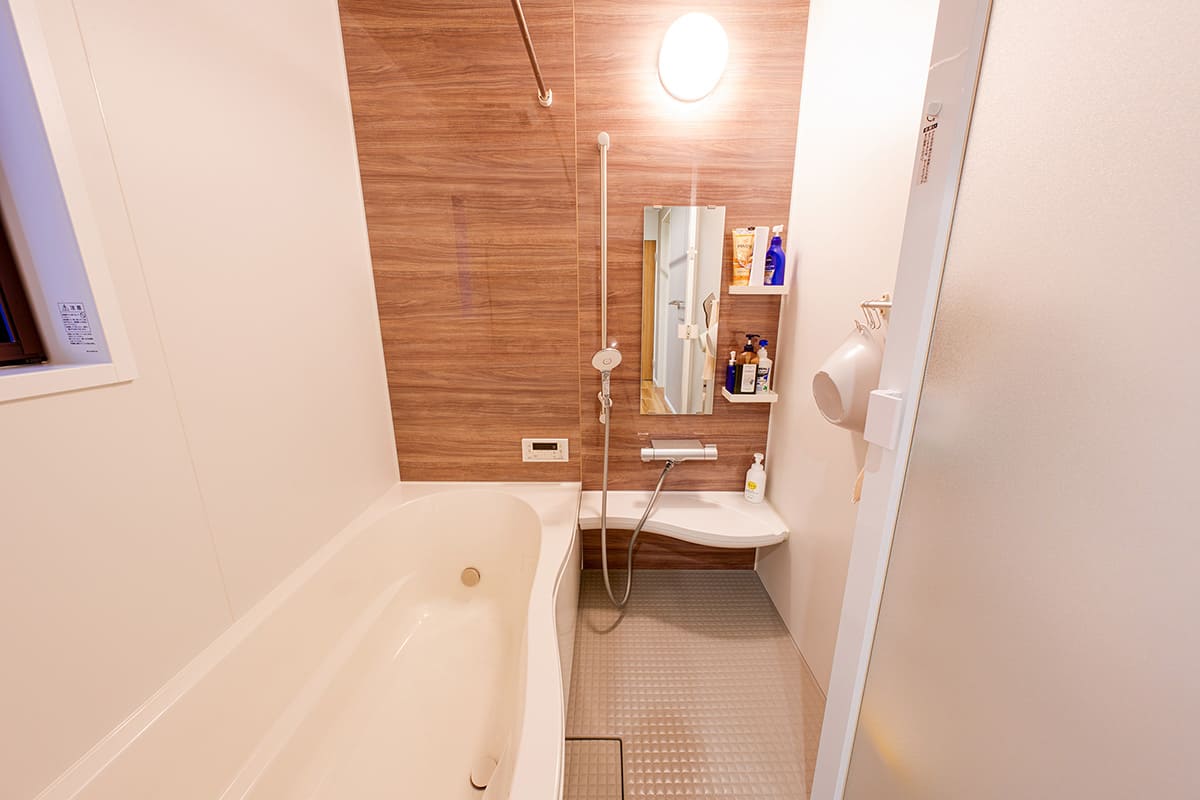 白を基調に落ち着いた木目柄で安らぐリラクゼーションスペースの浴室。