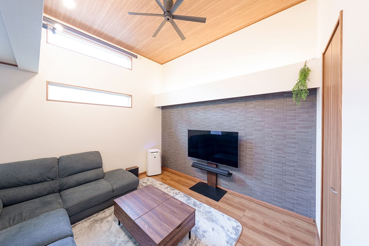 3.4mの高い天井ラインに設置したFIX窓から光が差し込む明るいリビング。