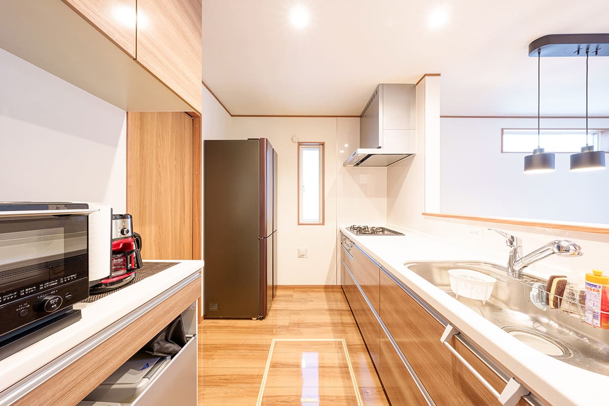 脱衣所、洗面所への家事動線を重視しつつもシンプルで使い勝手の良いキッチンスペース。