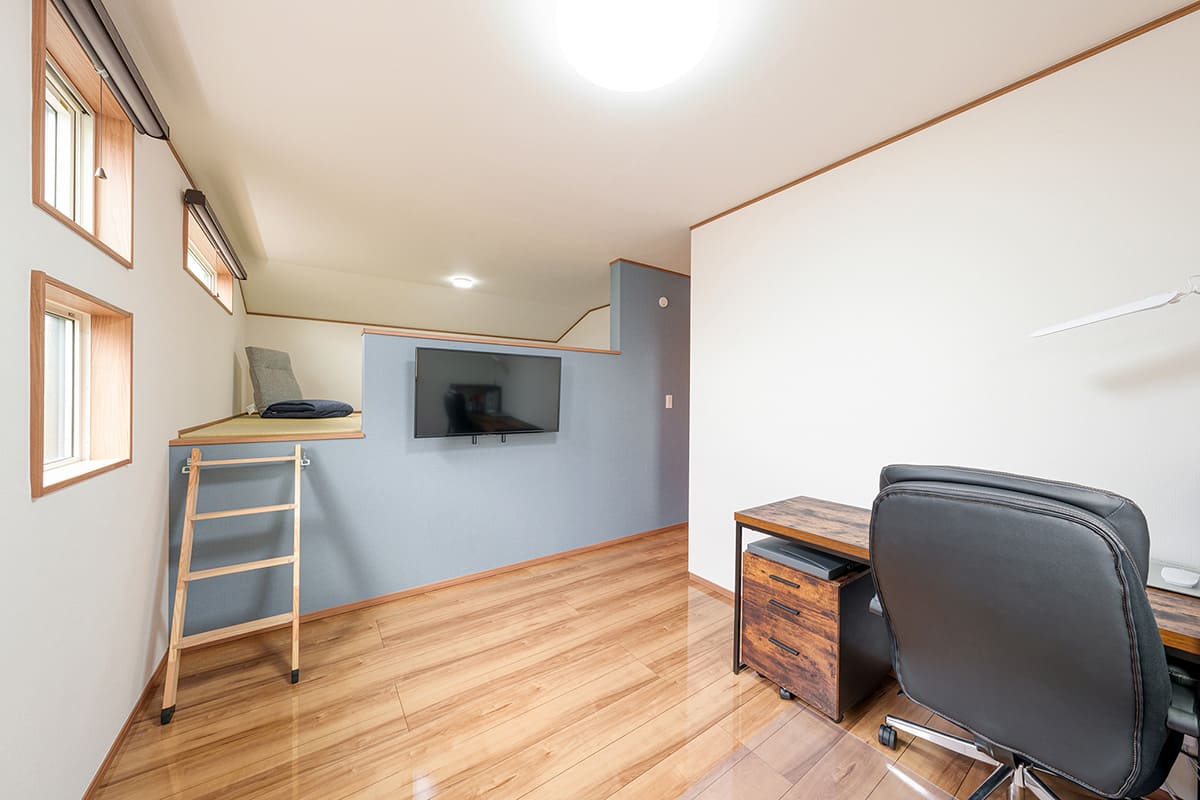 階下のリビング高天井を利用した小上がりロフト。ウォークインクローゼットを含め15畳の大空間に。