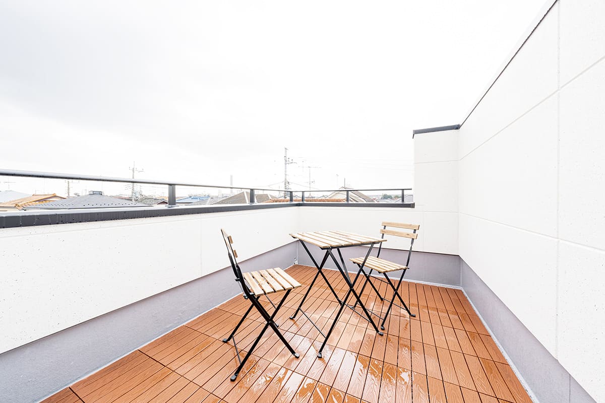 南東向きの開放感あふれる屋上バルコニー。日常の小休止や知人を招いてバーベキューに。