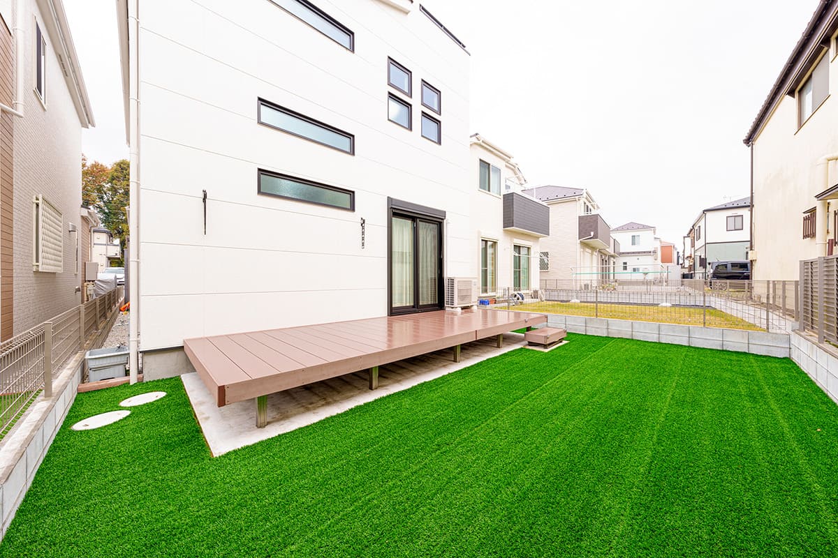 日々のメンテナンスが不要な人工芝を敷き詰めた庭。幅5mのウッドデッキと共に様々なシーンを演出。