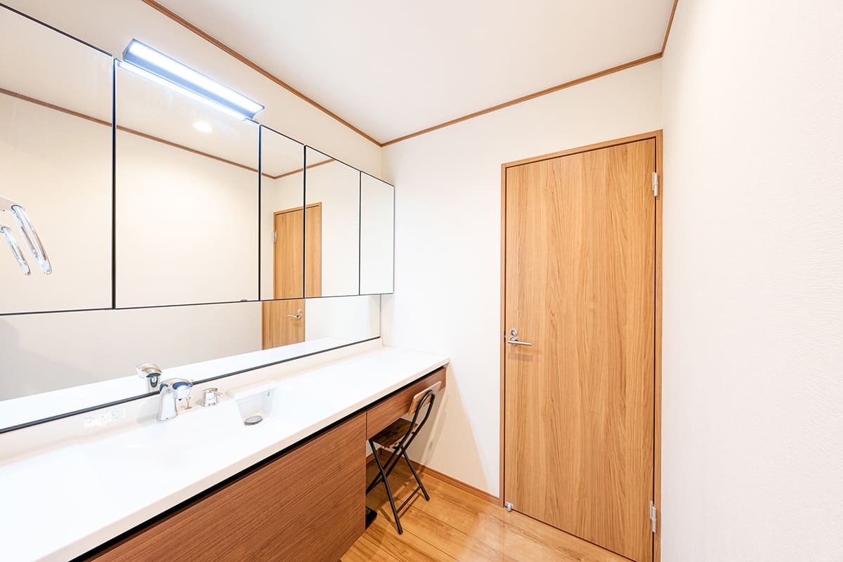 1650mmの横幅の洗面台を採用。廊下側とキッチン・脱衣所側の両方から出入り可能な動線で使い勝手は抜群。