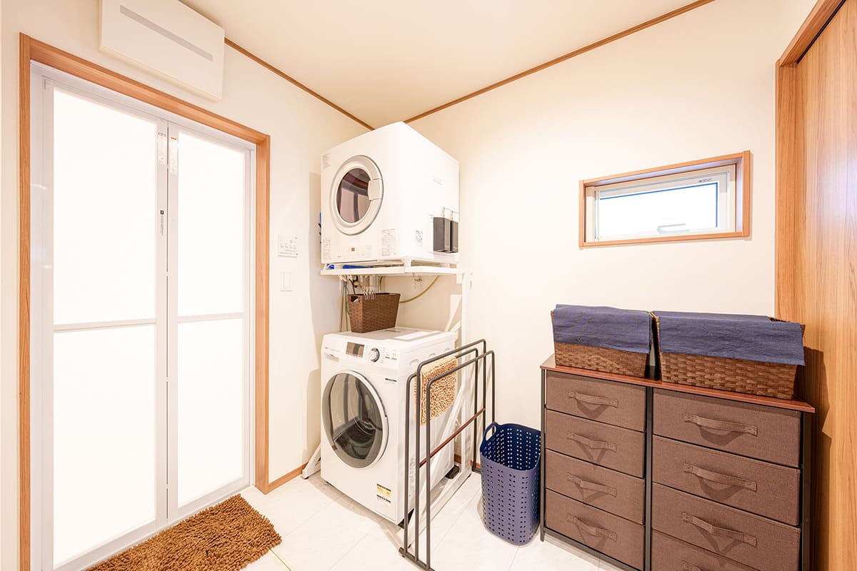 洗面所とは別に設けられた脱衣所は、小窓を設けることで通気性を確保。大型の洗濯機や収納を置いてもゆとりのスペース。