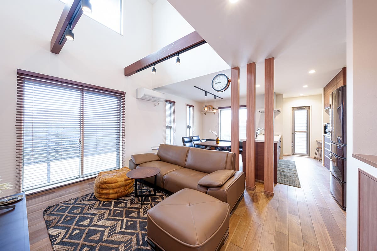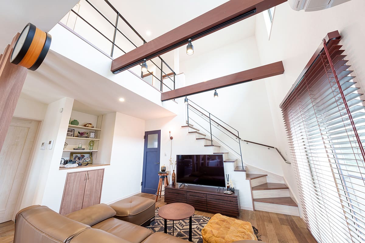 照明付きの梁、個性溢れるドア、アイアン手摺りなど注文住宅ならではのアイテムをふんだんに取り入れた吹抜のあるリビング。
