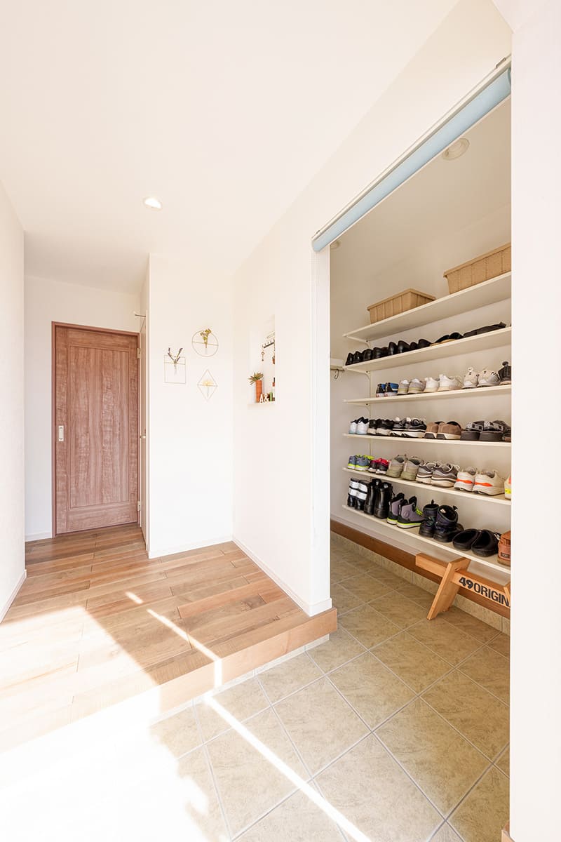 扉を設けず入口を広く取る事で出し入れのしやすい大型のシューズインクローク。