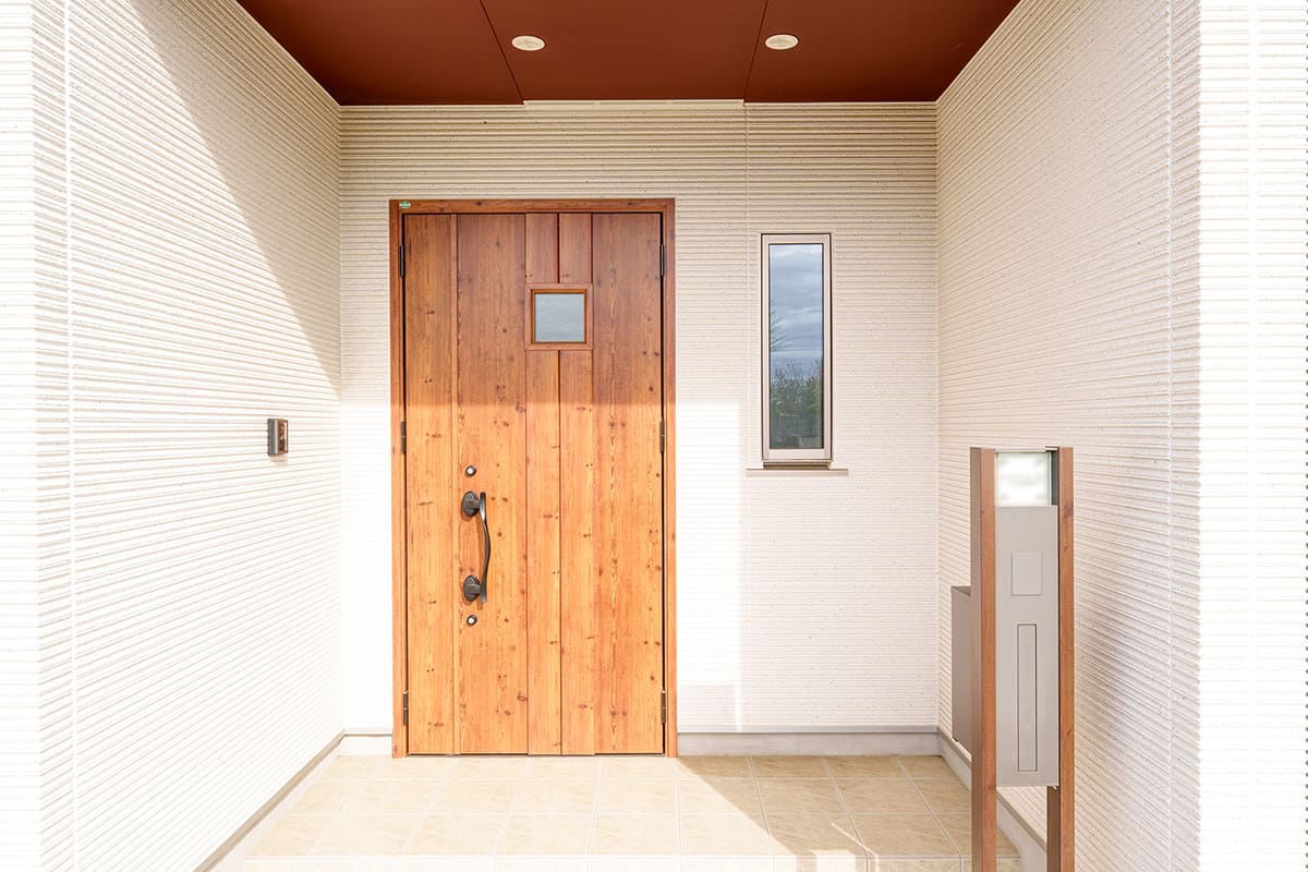 木目調の美しい玄関ドアと、雨天でも濡れずに出入りできる屋根のあるエントランス。