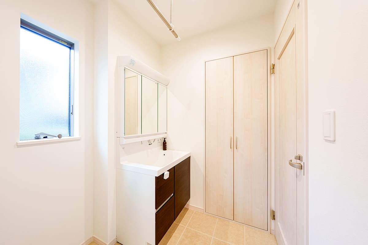 彩光と通風性の高い大型のすべり出し窓を採用した洗面・脱衣所。