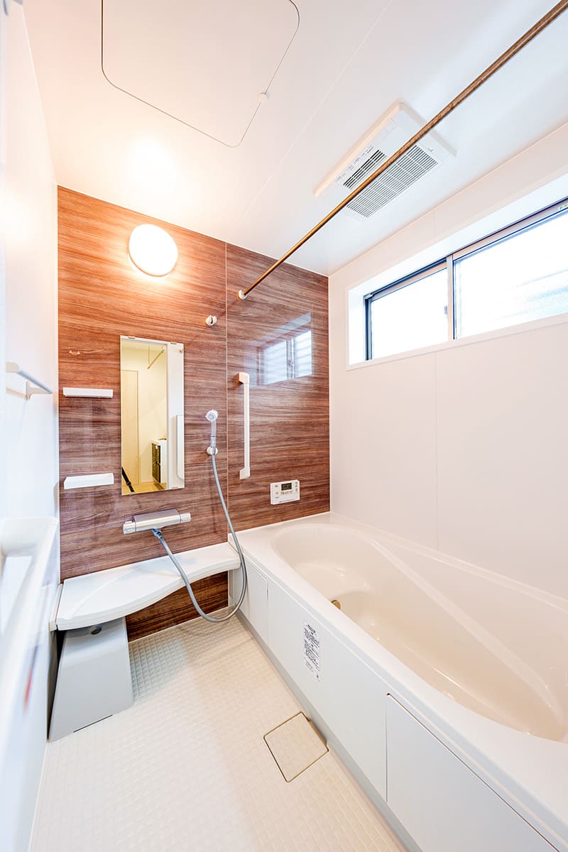 1坪タイプのバスタブを採用し、ゆったりと足を伸ばして寛げる浴室。上部に小窓を設置し、明るさと通風性を確保。