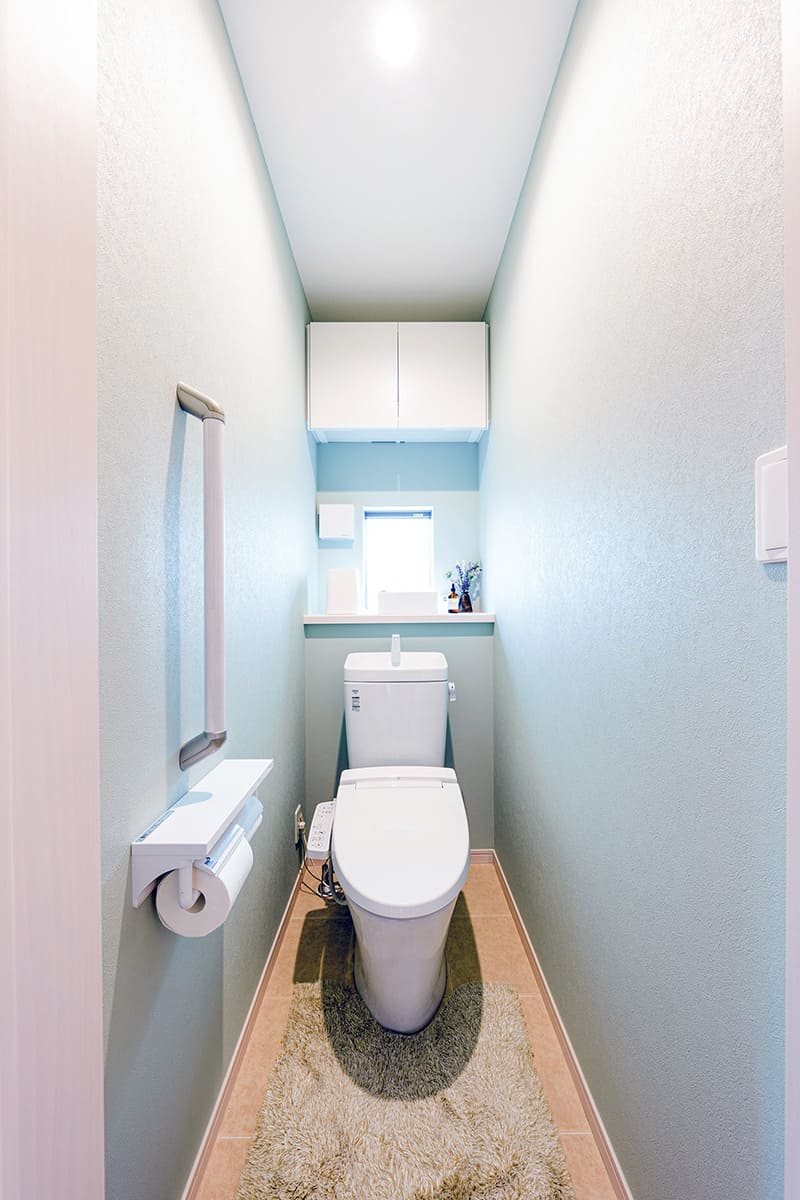 ミントグリーンの内装が美しいトイレ。1・2階にそれぞれ設置され忙しい時間帯でも快適に利用できる。