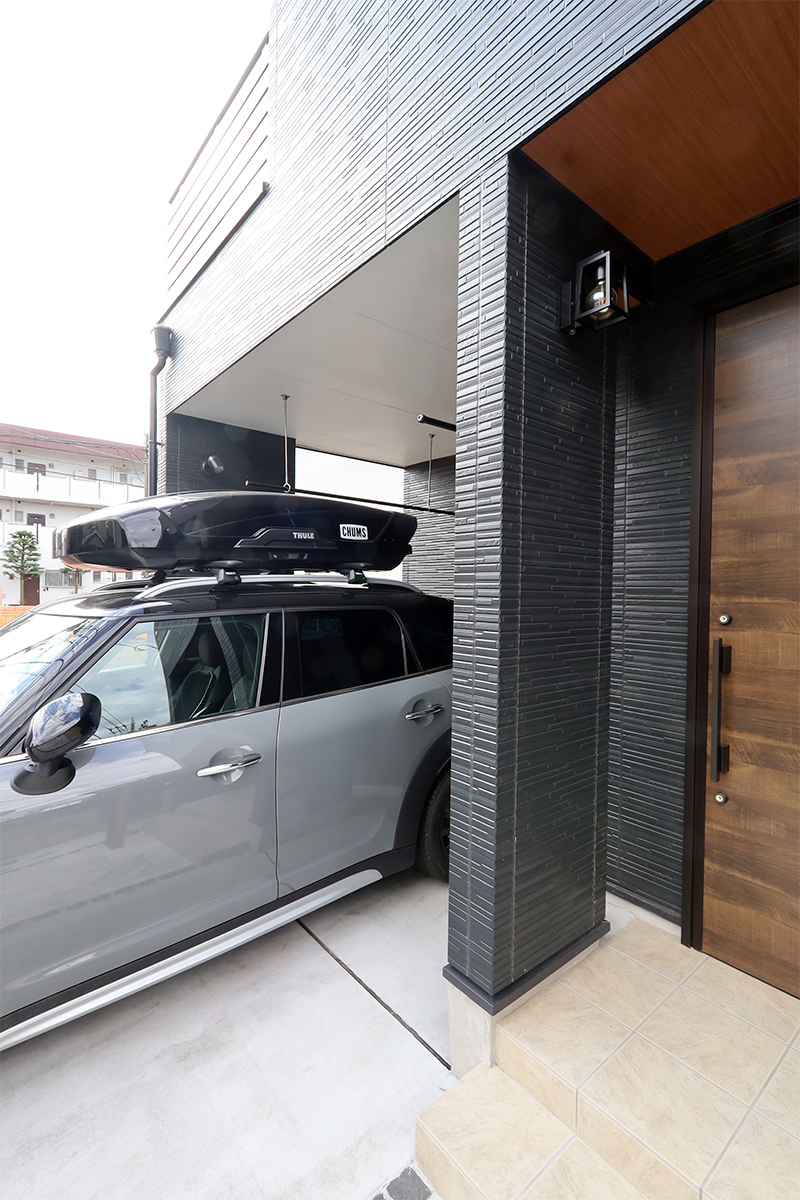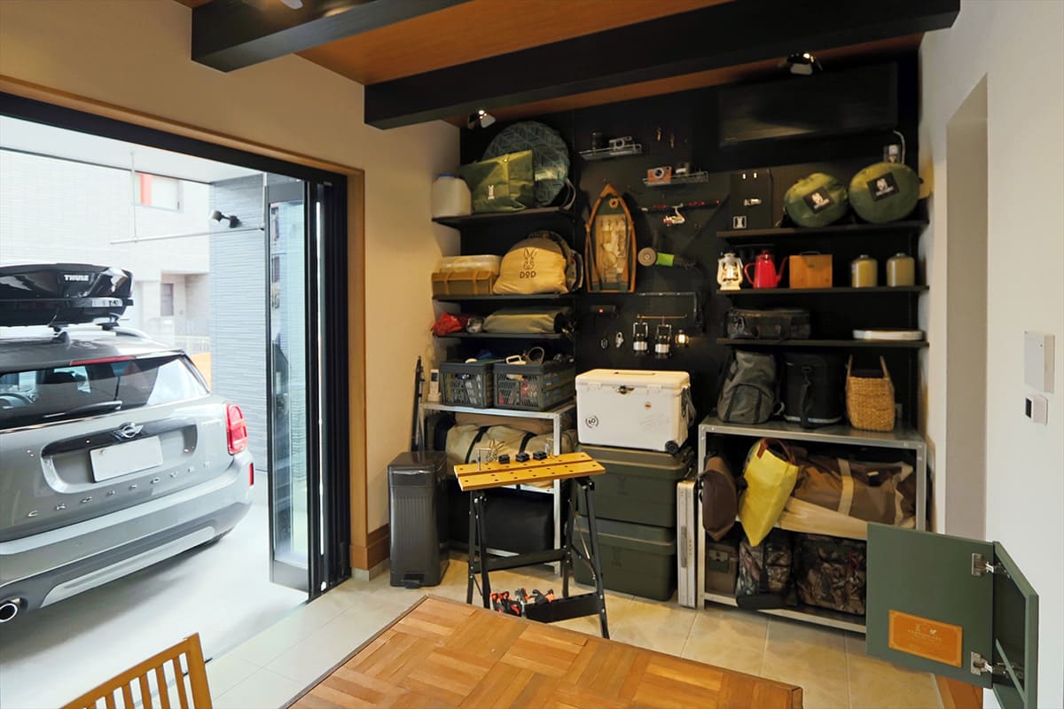 キャンプが好きでキャンプギアを収納できるアトリエを駐車場に直接アクセスできる位置に配置することで、雨の日も濡れずに荷物の積み下ろしができ、愛車を眺めながら至福の時間を過ごせる空間ができました。