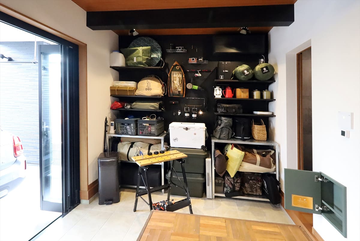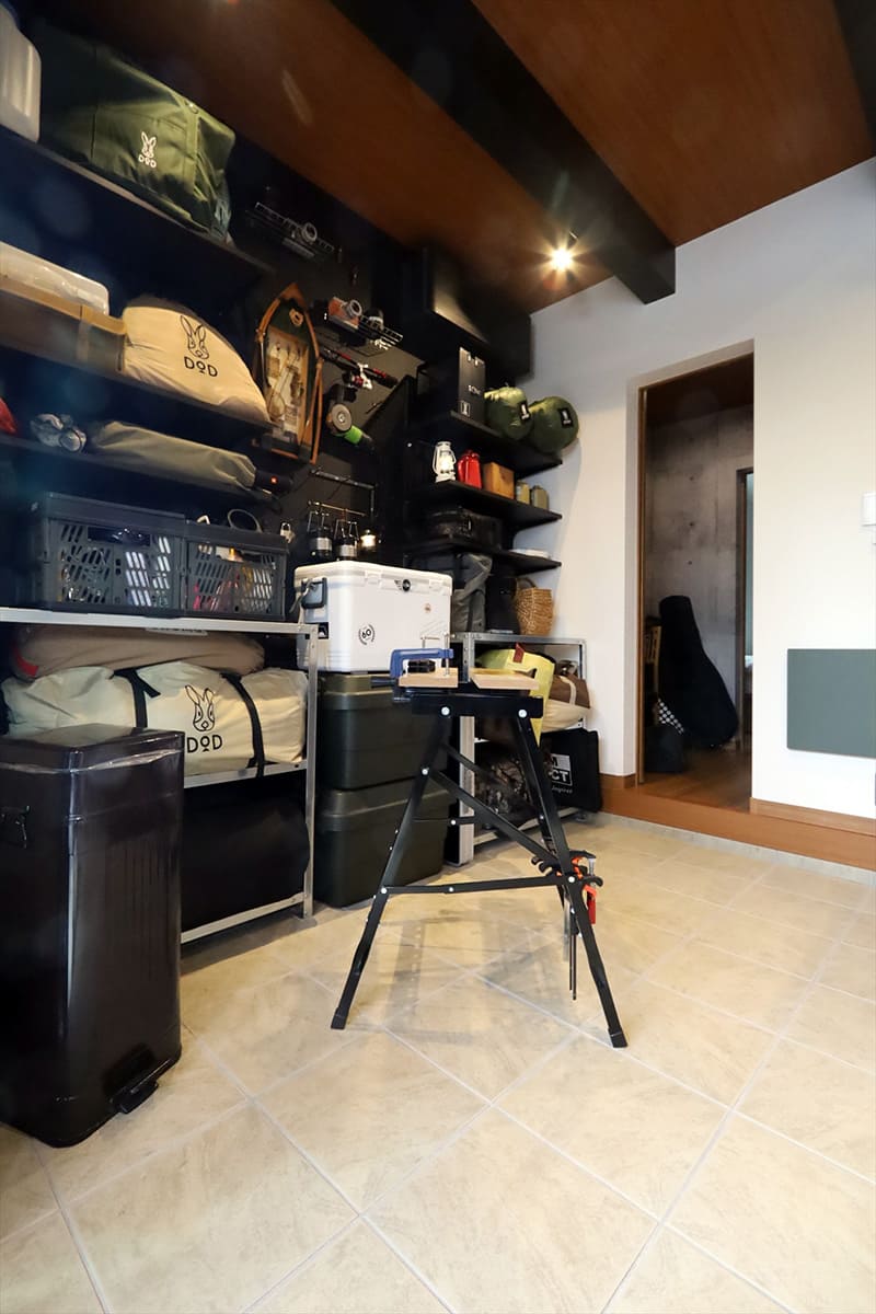 人気のアウトドアブランド:DODとユニバーサルホームのコラボ企画「キャンパーの住みか」のエッセンスがふんだんに盛り込まれたアトリエ。壁面収納でキャンプ道具もたっぷり収納。