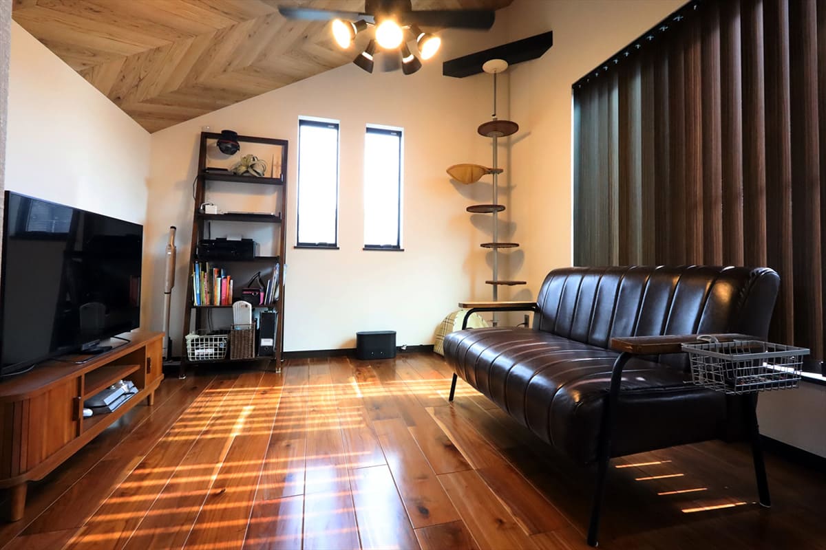 梁の見える勾配天井を採用し、ヘリンボーンの壁紙とダークブラウンの床材が美しいリビング。
