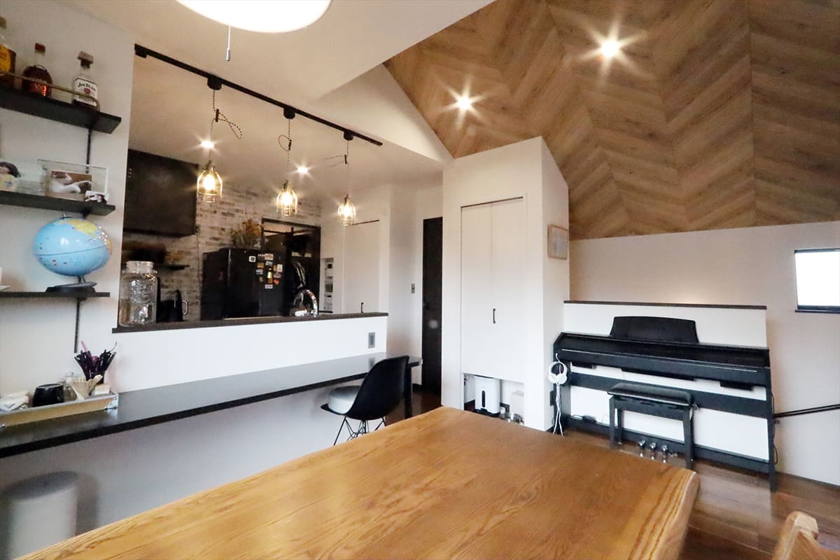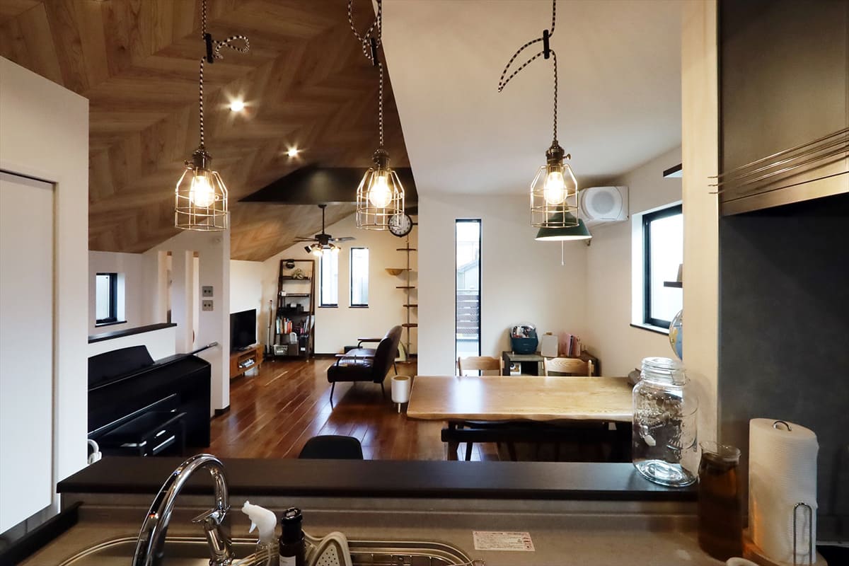 ランタン風のペンダントライトをセンス良くレイアウトしカウンターキッチン越しにリビングダイニングを見渡せる。