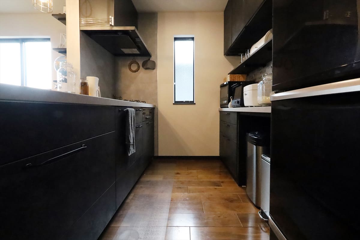 リビングから続くダークブラウンの床材とカラーマッチした面材を採用したゆとりのキッチン。
