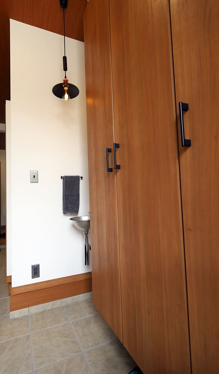 大容量のシューズクロークに加え、おかえり手洗いを設置。帰宅後すぐに手洗いができる。