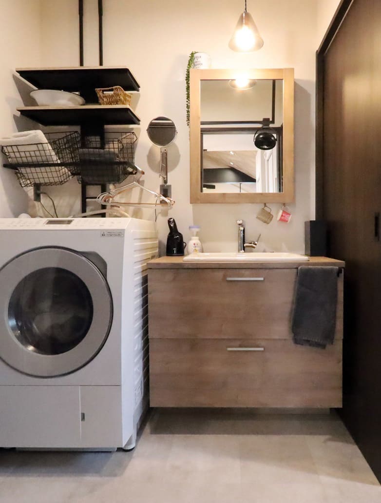 美しい面材がおしゃれな洗面台、2Fキッチン近くに、水回りとファミリークロゼットを併設させることで、洗濯から乾燥、収納までシームレスにおこなえる。