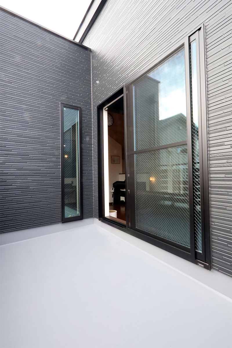 2階リビングの横に大きめのバルコニーを設置。南向きで開放感に溢れ、タープ用の壁フックも設置により“おうちでキャンプ” も可能。