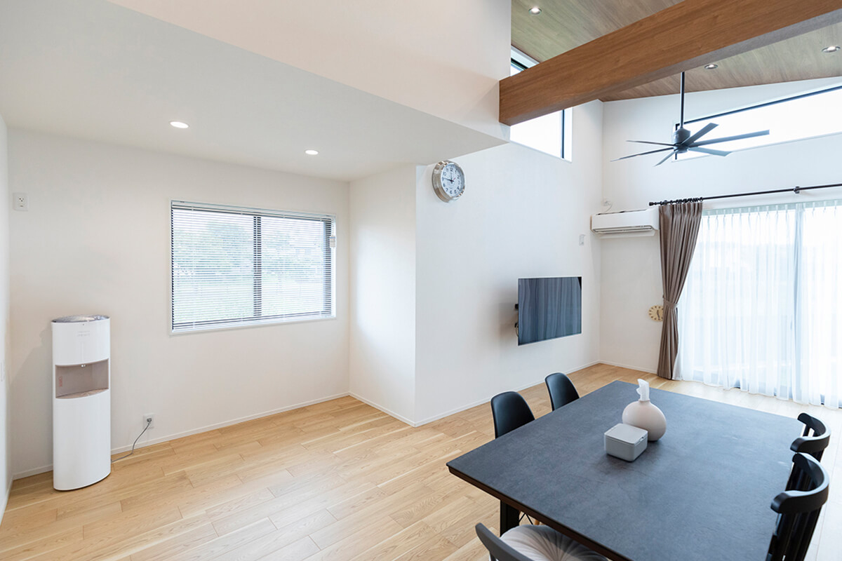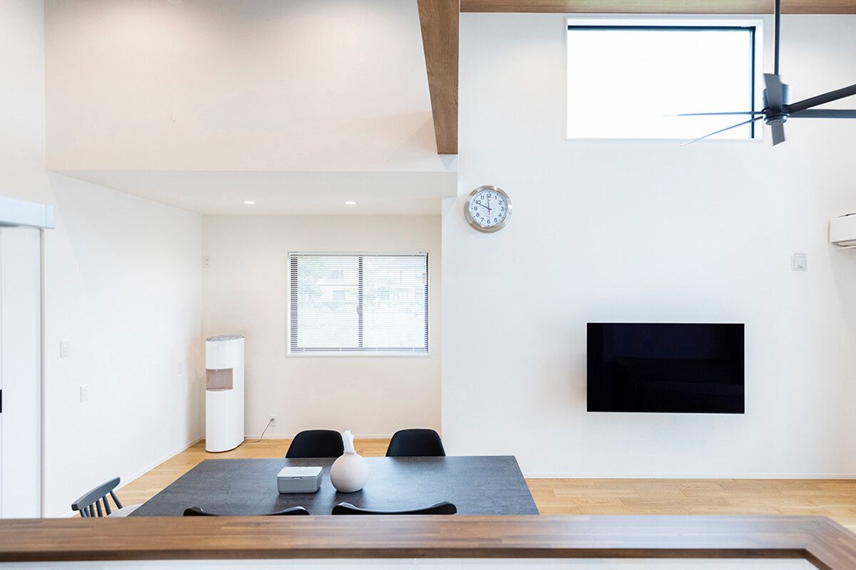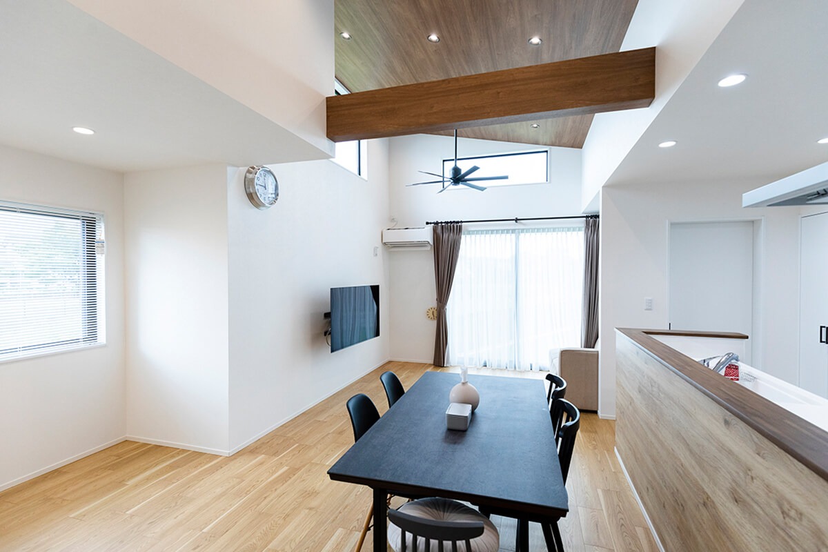 最高点約4mの勾配天井、高い位置に配置した大きな明り取り窓が開放的な空間を演出するリビング。