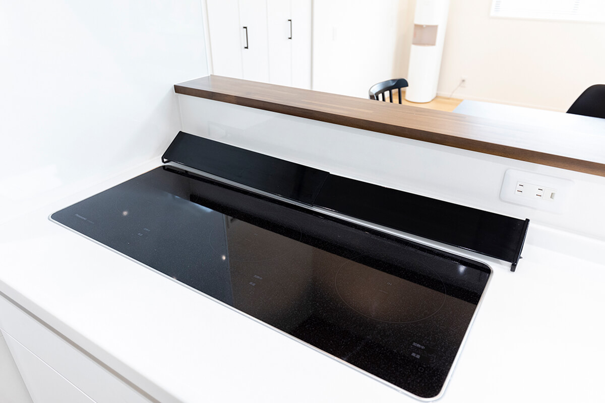 3つ同時調理が可能な横並びの3口ワイドIH、作業スペースにコンセントを設けるなど、こだわりの詰まった使い勝手抜群の調理スペース。