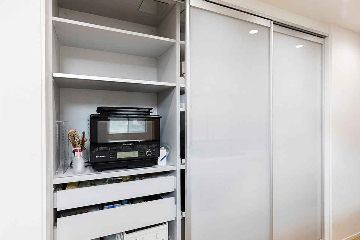 乱雑になりがちなカップボードは電子レンジなどの家電も隠せる扉付き仕様。