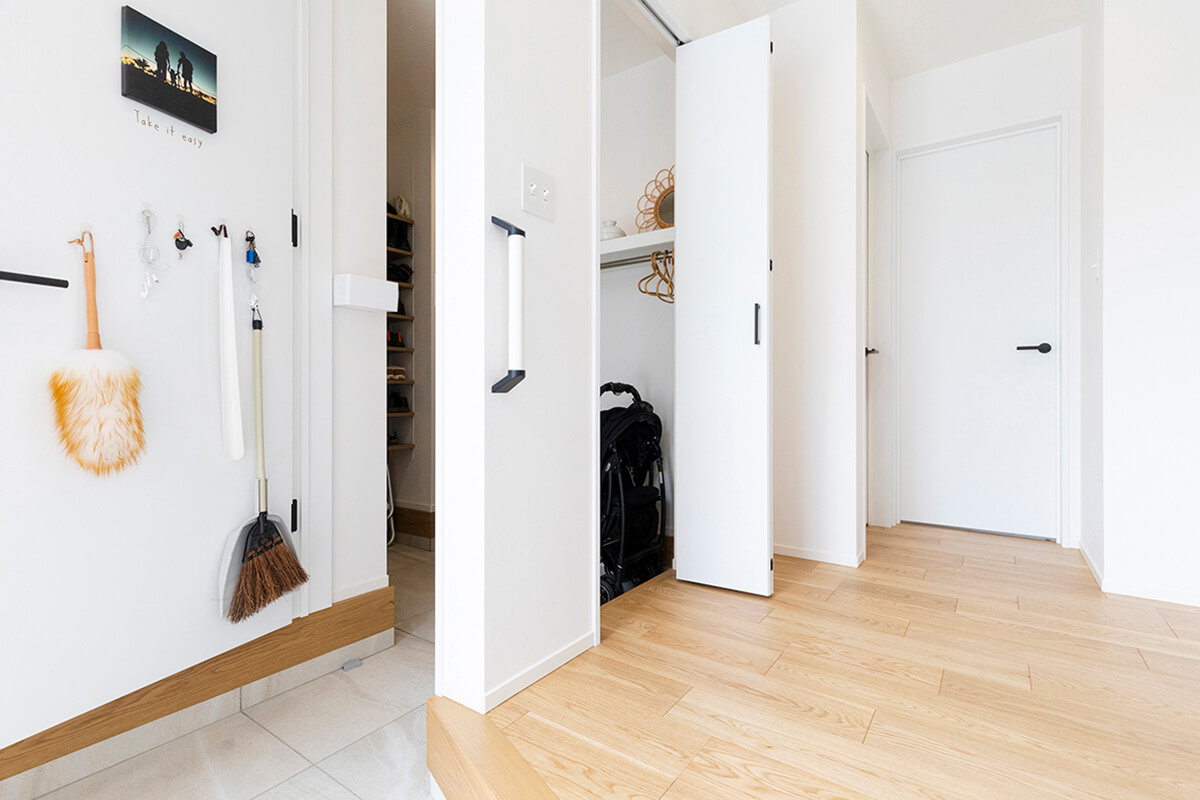 玄関側、室内側両方から出入り可能なシューズクローク。収納空間を2段階にし、普段使いの多いベビーカーやほうきを使い勝手の良い玄関近くに。