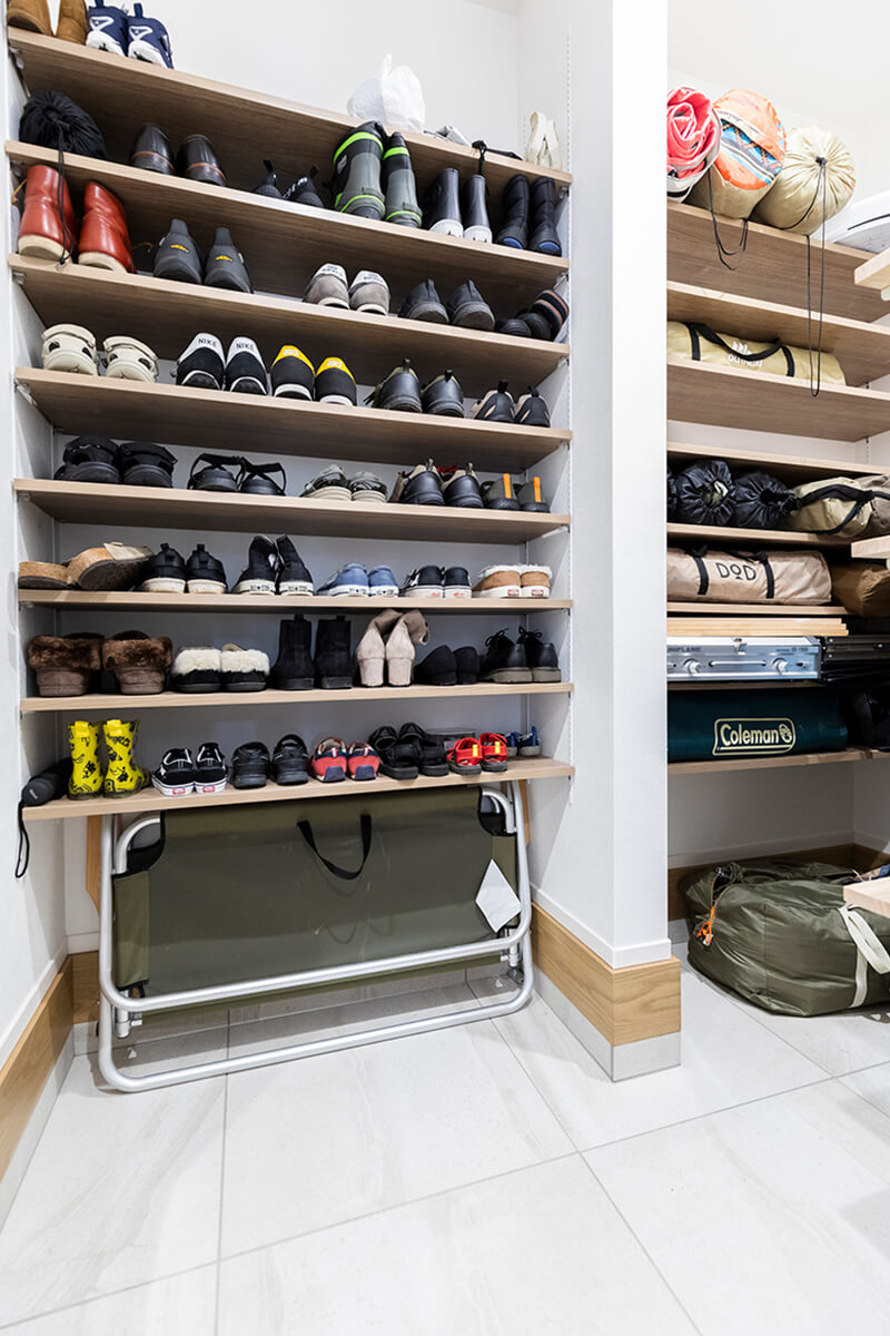 家族4人分の靴、アウトドアグッズが収まった来客からは見えにくい大容量のシューズクローク。賃貸住まいの頃と異なり、アウトドアグッズの出し入れが格段にラクに。
