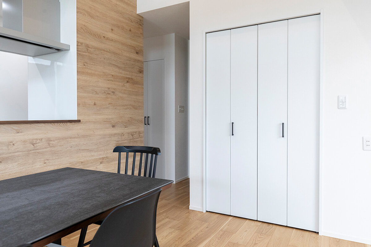 ダイニングの横に配置された大型の収納。散らかりがちなリビングダイニングもモノの溢れない空間に。