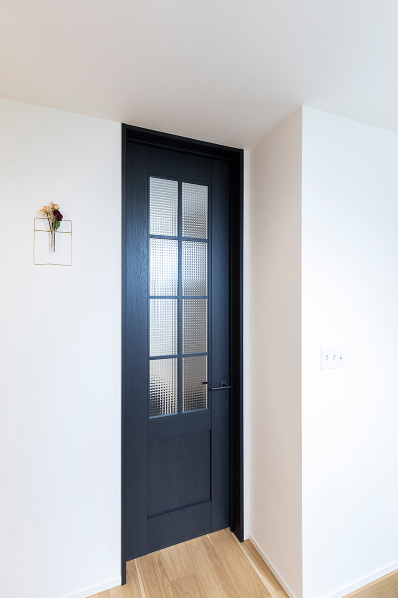 来客を迎え入れるリビングの入口は、クロスの白とは対極のブラック。インパクトのある天井まで届くハイドアを採用。