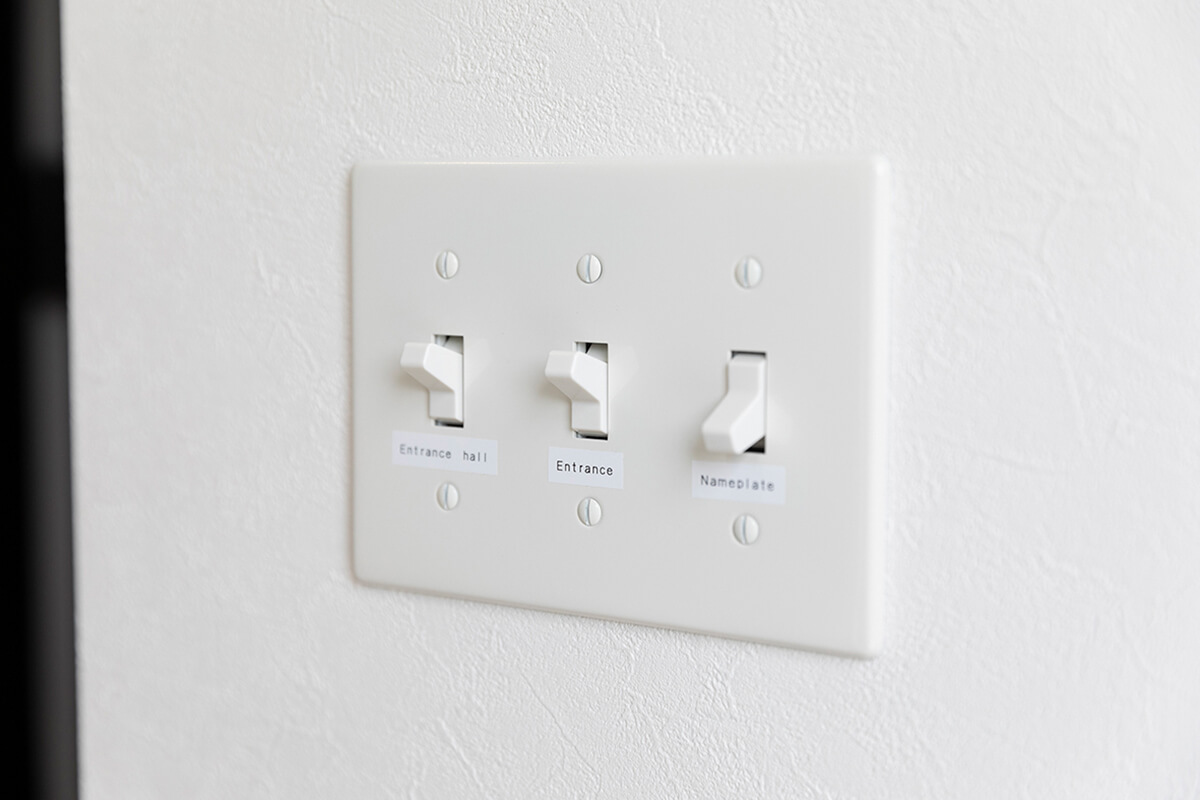玄関廻りのスイッチにはオシャレなアメリカンスイッチ。注文住宅ならではの遊び心。