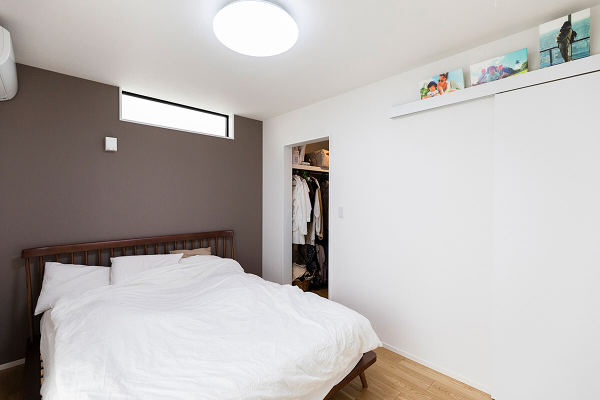 アクセントクロスで落ち着いた印象を与える主寝室。部屋の奥には夫婦の衣服が並ぶ2畳のウォークインクローゼット。