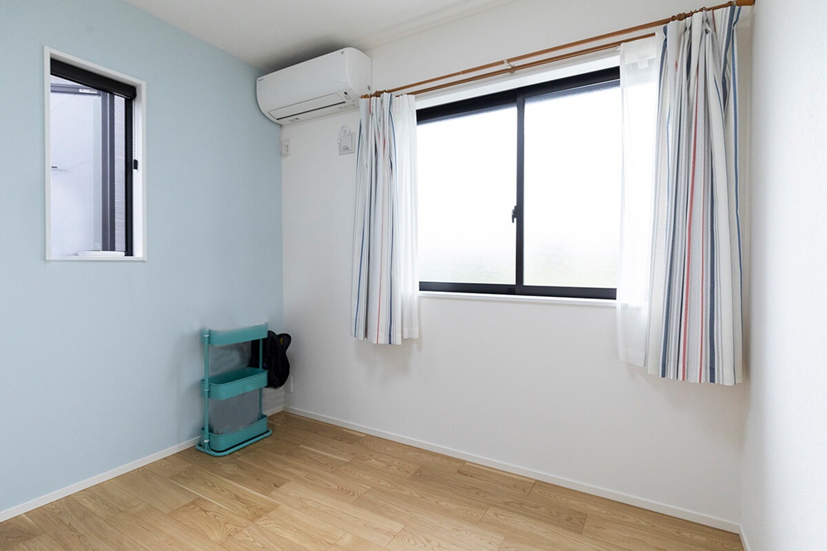 爽やかなブルーのアクセントクロスと2面採光で明るい印象を与える子供部屋。