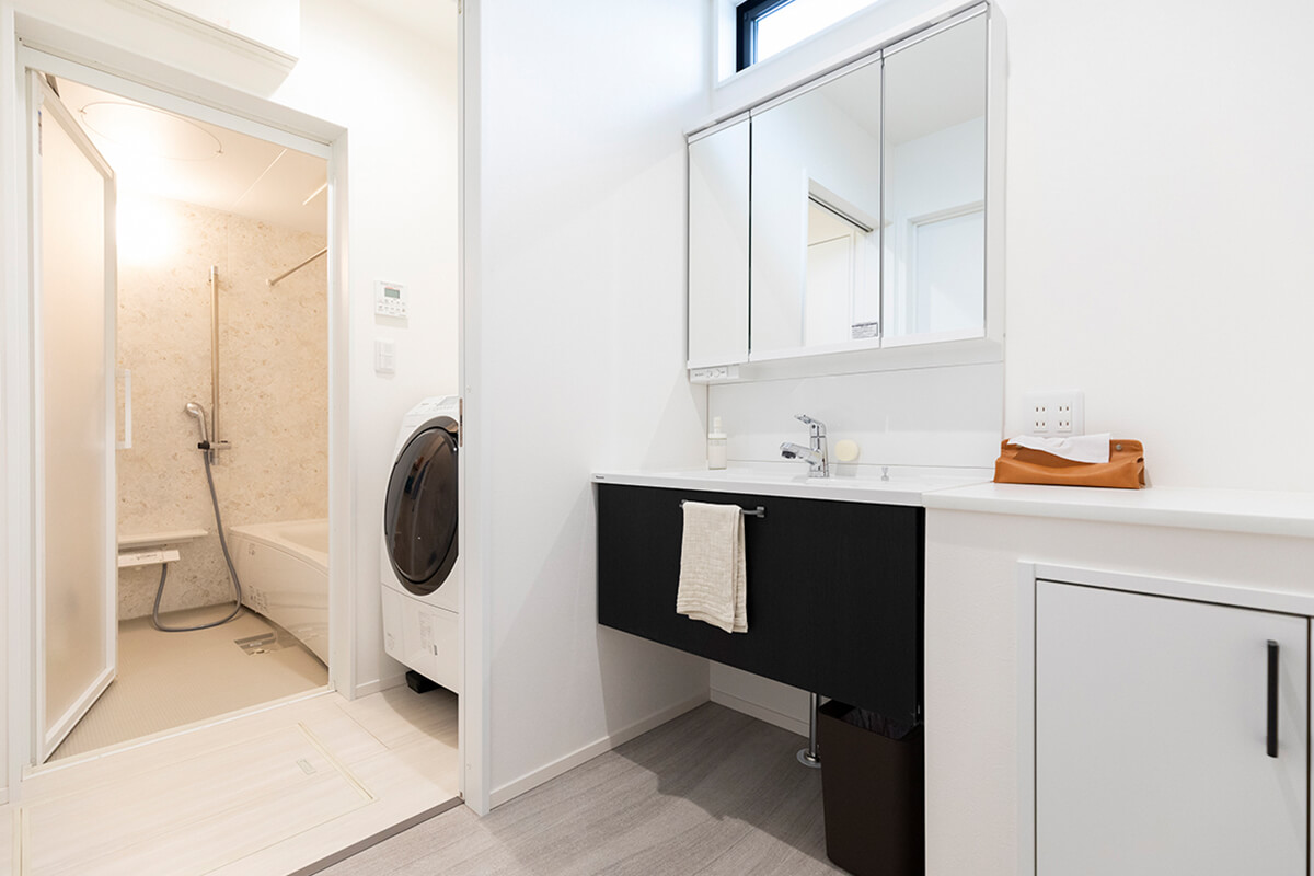子供が大きくなった際も考慮して、引き戸で間仕切り出来るよう脱衣室を設置。洗面台の横には使い勝手の良いカウンター収納を設置。
