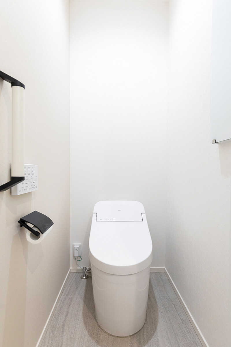 掃除がラクなタンクレスのトイレ。アクセサリーは黒を取り入れて空間のアクセントに。