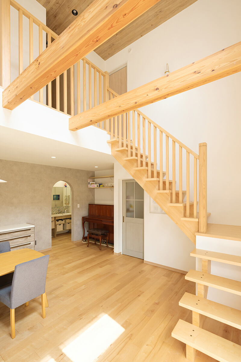 途中に踊り場を設けて安全性に配慮したリビングin階段。踏み板や手すりも木の質感を重視、木を見て触って感じる仕様に。