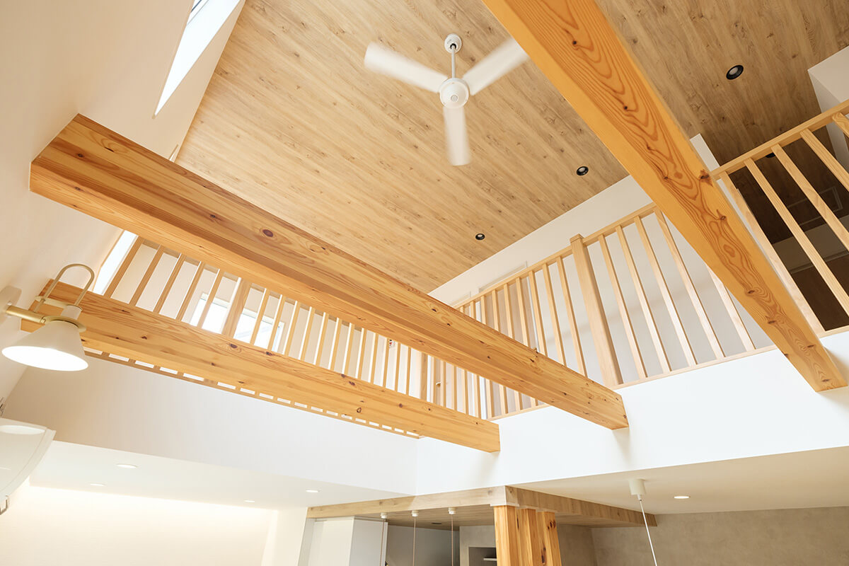 構造材としても強い集成材の梁をあしらい、天井に取り付けたシーリングファンで室内の空気循環にも配慮した5mを超える吹抜け。