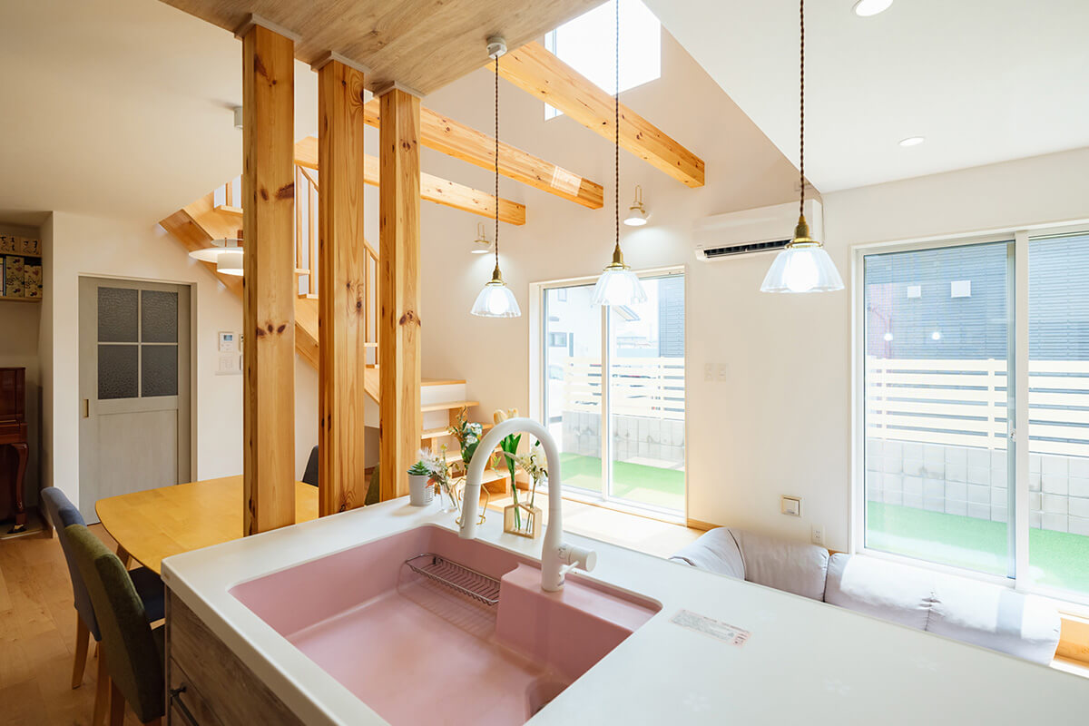 外を眺めながら料理できるオープンなキッチン。ピンクのシンクや花柄のエンボス加工を施したワークトップが奥様のお気に入り。