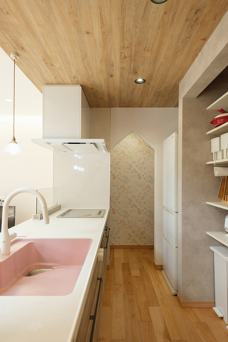 キッチンの背面収納と共に、奥には出入り口を三角の下がり壁にした花柄のクロスで華やかなパントリーを配置。たっぷりの収納で調理家電、ストックの食品が溢れることなく、見た目にもスマートなキッチンまわり。