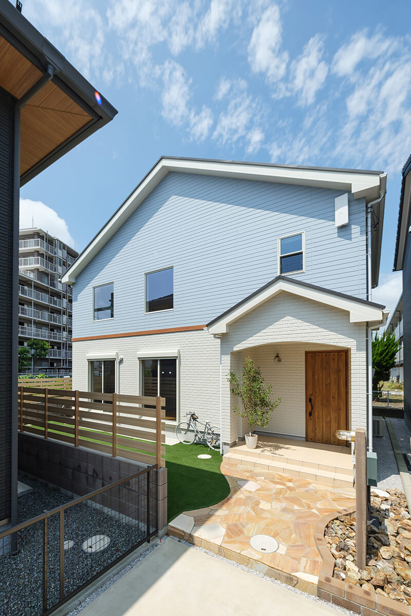 イメージ通りの三角の切妻屋根と1階・2階を貼り分けたパステルカラーで優しい雰囲気の外観デザイン。