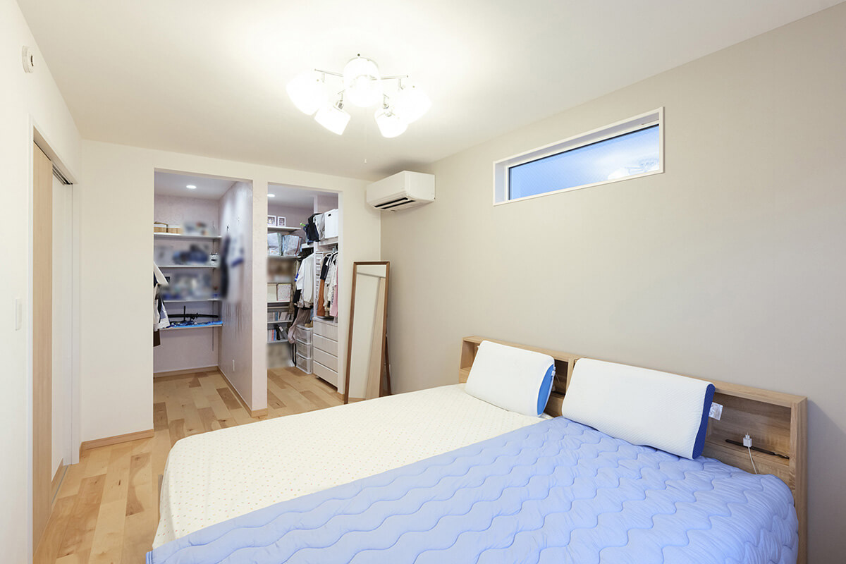 ご夫妻それぞれがコレクションしている趣味のグッズを並べる棚を設置したウォークインクローゼット。夫婦ともにお気に入りの主寝室。