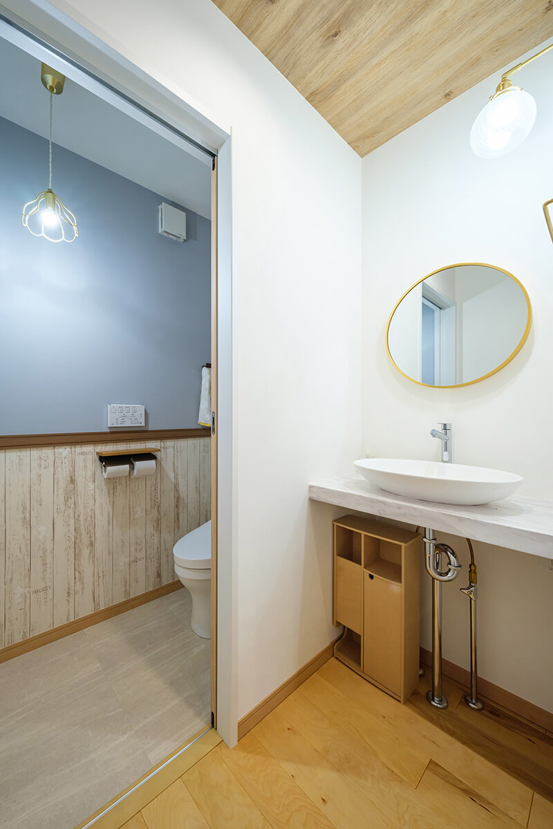 2階でも手が洗えるように設置されたデザイン性重視の洗面。トイレは上下で印象の異なるクロスを貼り、自身で探した照明器具でこだわりの空間に。